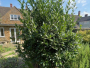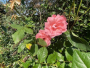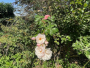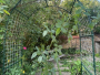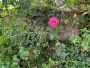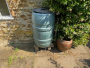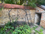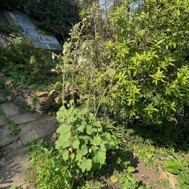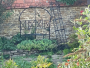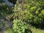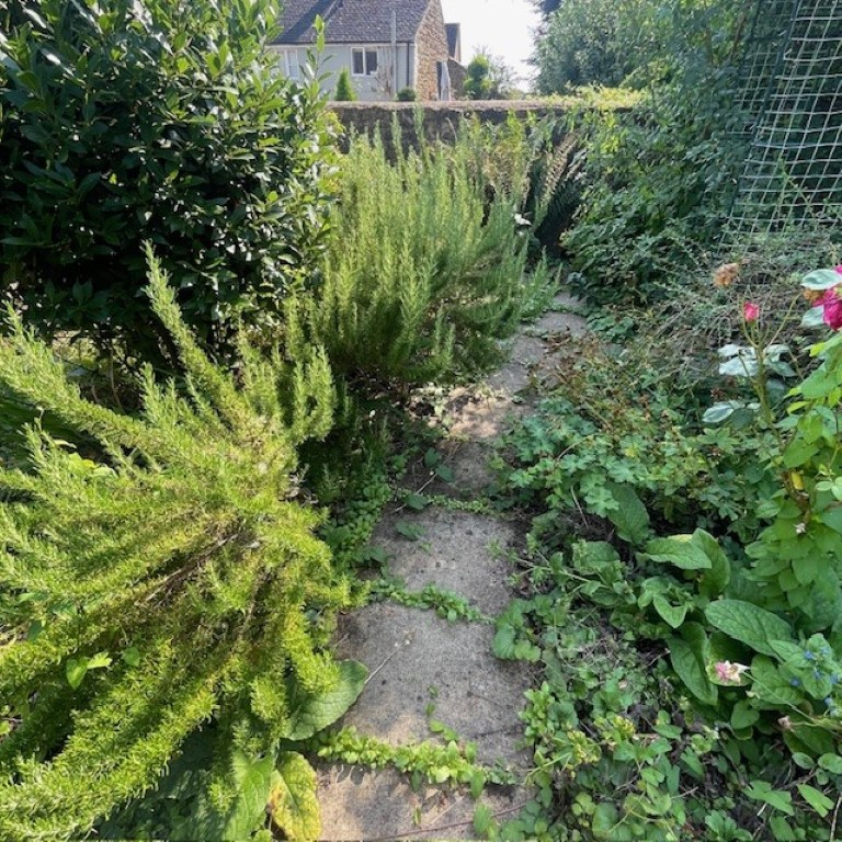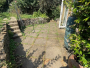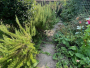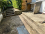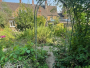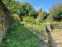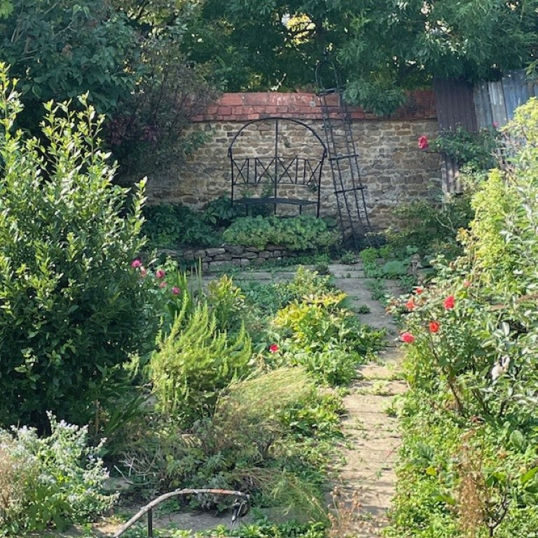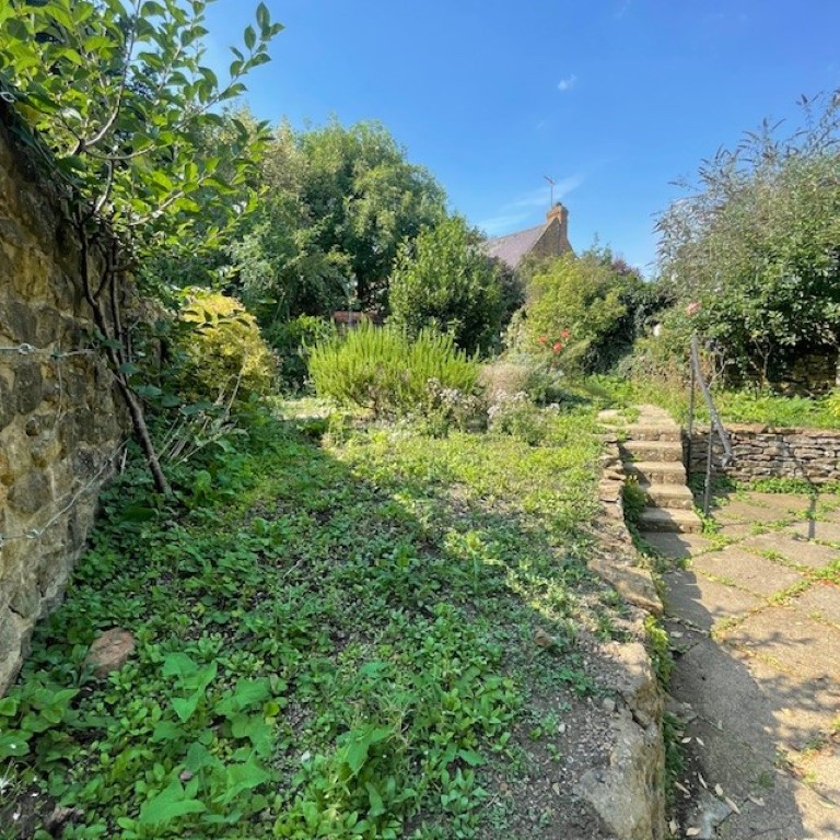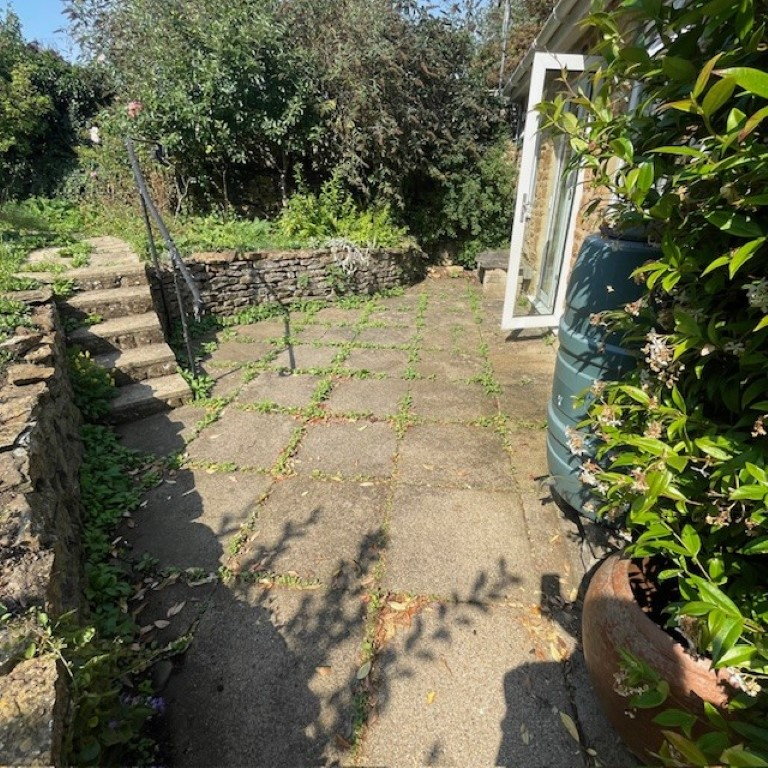 West facing rear garden with flower borders, and steps to a paved terrace, and a small brick/stone outhouse.