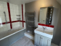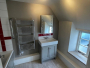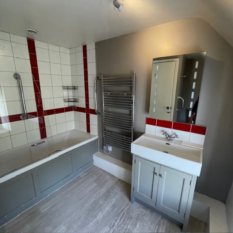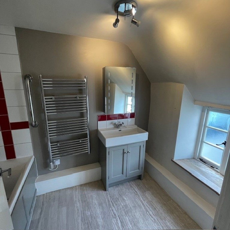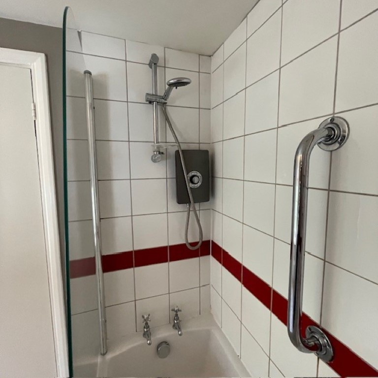 Bathroom: Family bathroom with bath and a shower over the bath, as well as a handbasin and WC.