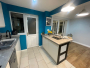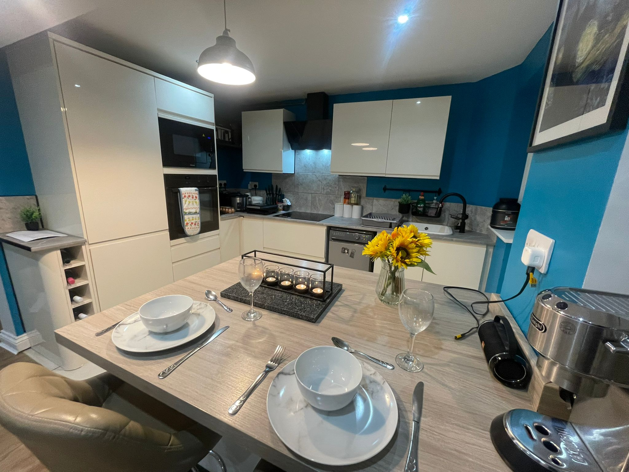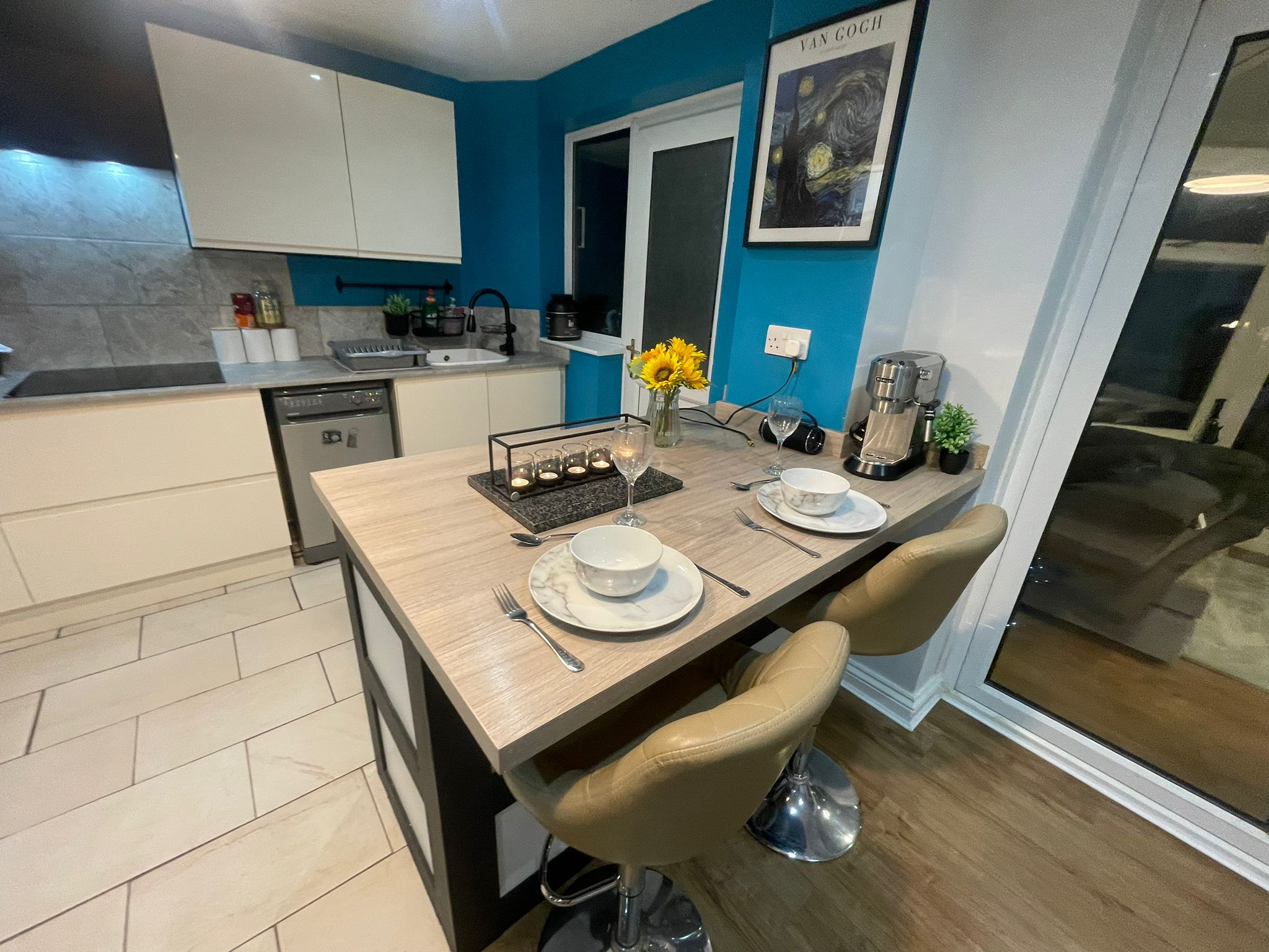 The modern fitted kitchen includes a breakfast bar with seating for two, a range of contemporary cabinets, laminate work surfaces, and a stainless-steel sink with drainer. Integrated appliances include a cooker, fridge-freezer, dishwasher, and washing machine. A glazed door provides direct access to the rear garden.