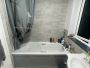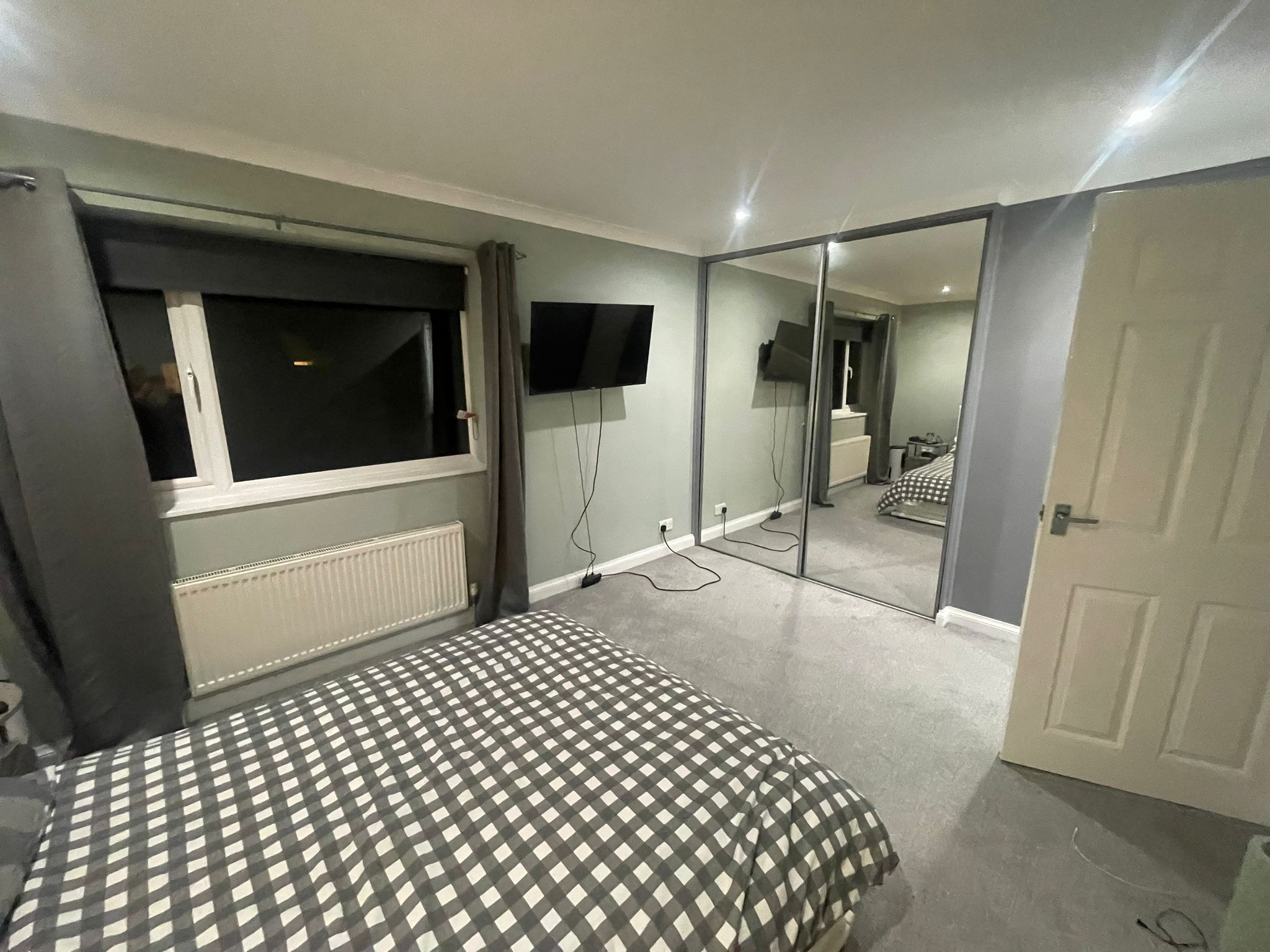 Upstairs, the landing leads to two double bedrooms and the family bathroom. The main bedroom features a king-size bed, fitted wardrobes, and a front-facing window. The second bedroom includes a double bed and built-in wardrobe. The bathroom is fitted with a WC, wash basin, and panel bath with a dual-head shower.