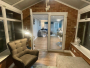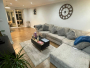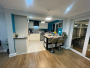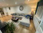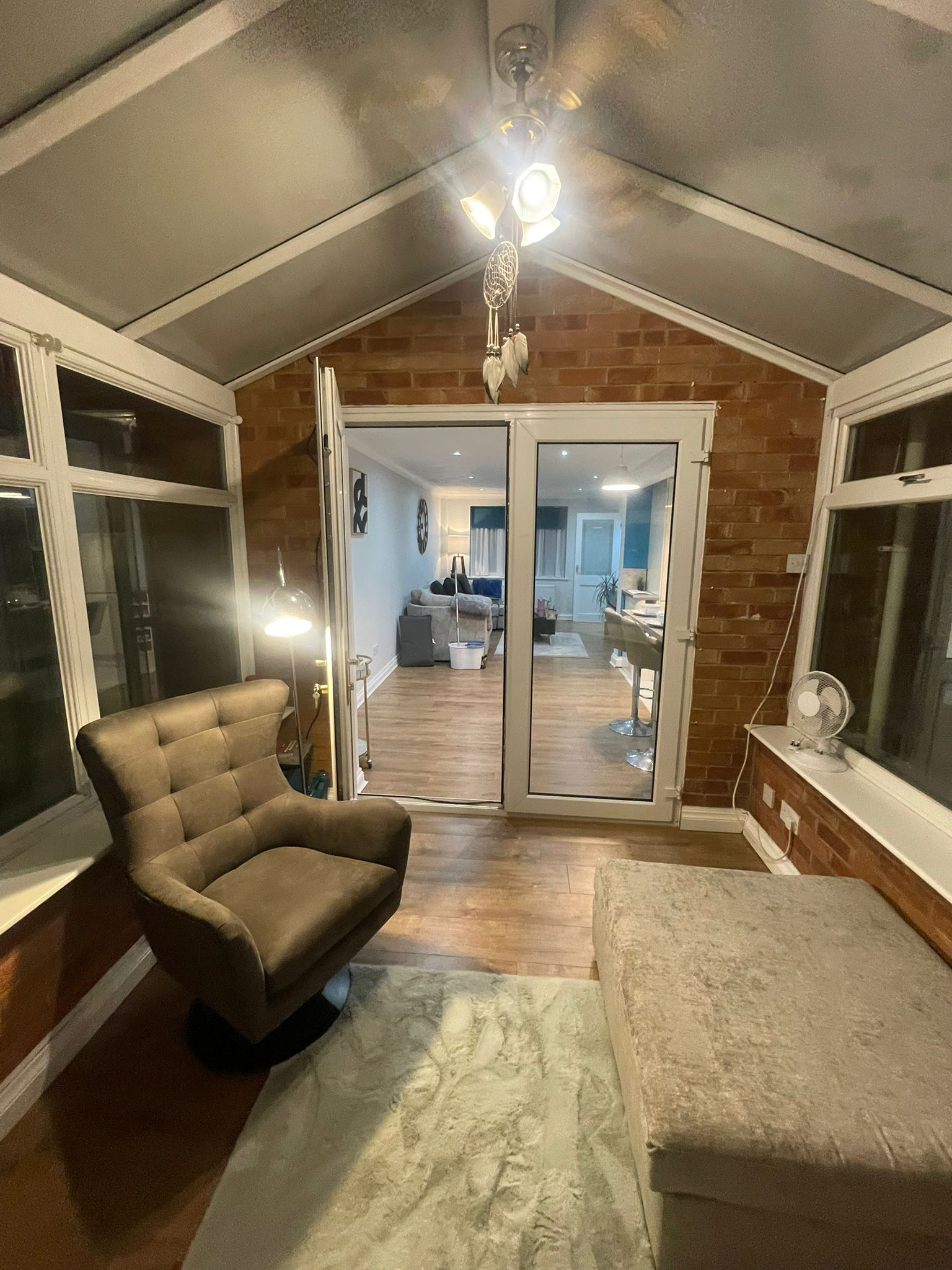 The bright and airy open-plan living/dining room enjoys dual-aspect windows, featuring a large comfortable corner sofa and wall-mounted TV. Patio doors lead to the conservatory, furnished with a cosy lounger chair and footstool—perfect for relaxing while overlooking the rear garden.