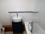 The bathroom (2.74m x 1.9m) is fitted with a three-piece suite comprising a bath with Triton shower and handheld attachment, full-height tiling around the bath area, pedestal wash hand basin with wooden cabinet beneath, low-level WC, and tiled flooring.
