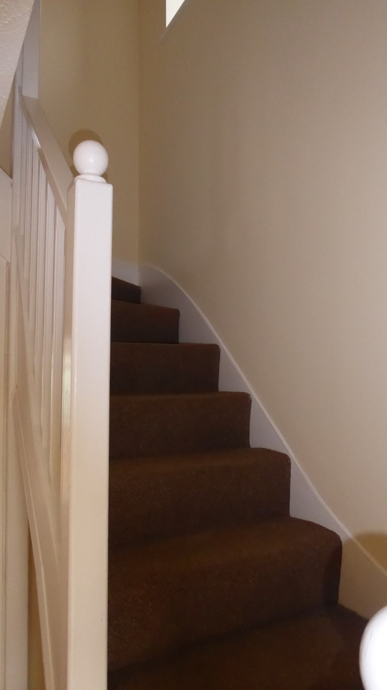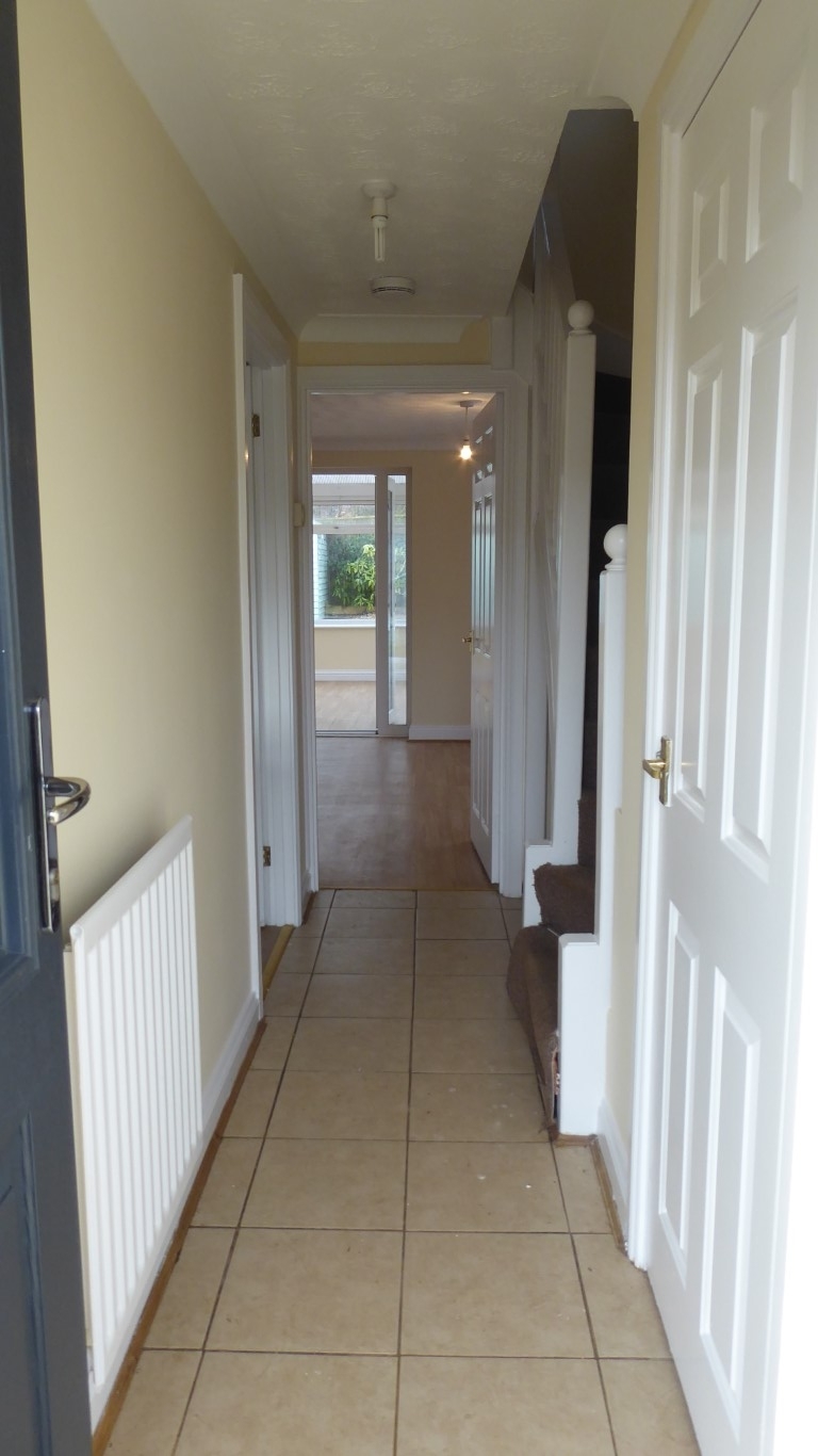Dog-leg stairs to first floor landing. Under-stairs storage area. Cream tiled floor, radiator. Doors to kitchen and lounge.
