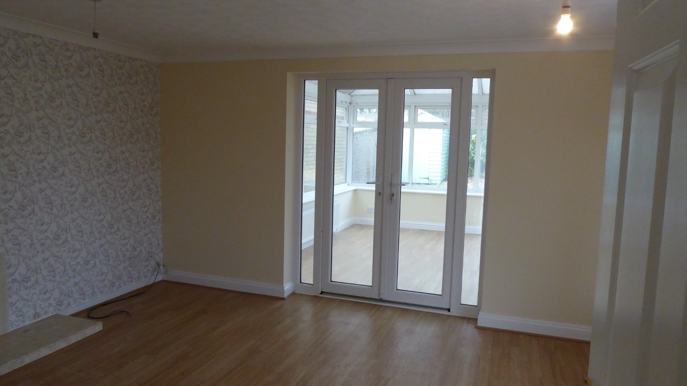 Lounge/Dining Room. Papered featured wall with a marble fireplace where the electric fireplace has been removed, Two radiators. T.V. Point. Telephone point. Laminate wood flooring. Double glazed window to side aspect. Patio doors to conservatory
