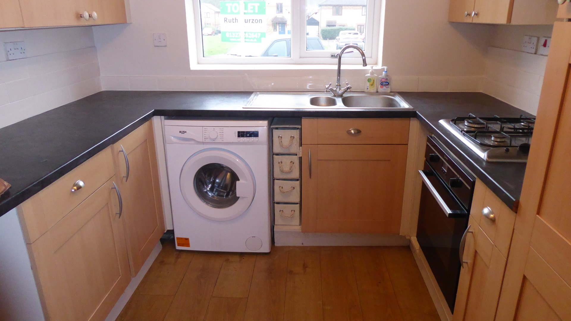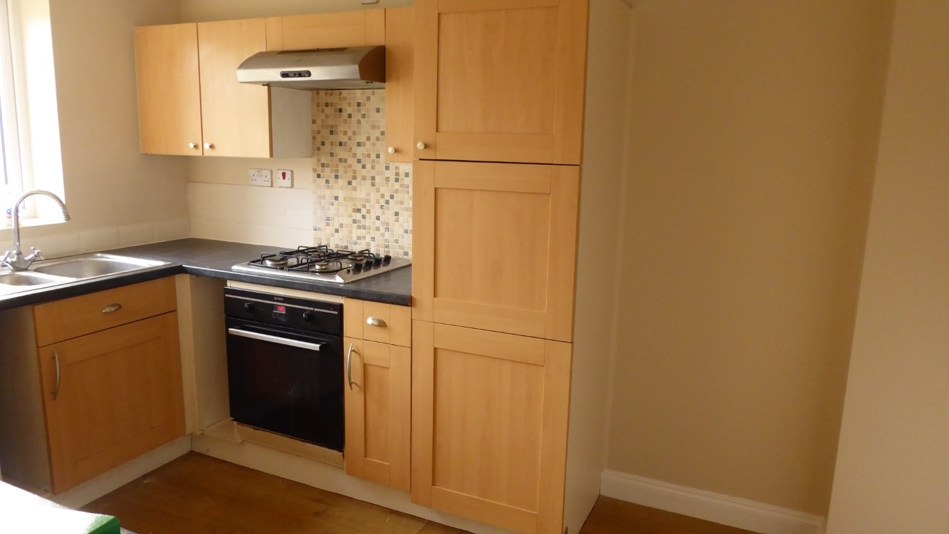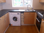 Range of eye-level and base kitchen units. Oven with separate gas hob with extractor over. Inset sink with mixer taps. Roll edge work surfaces with tiled splashbacks. Washing machine is provided and space fridge/freezer, Laminate wood flooring. Double glazed windows to front aspect. Combination boiler.