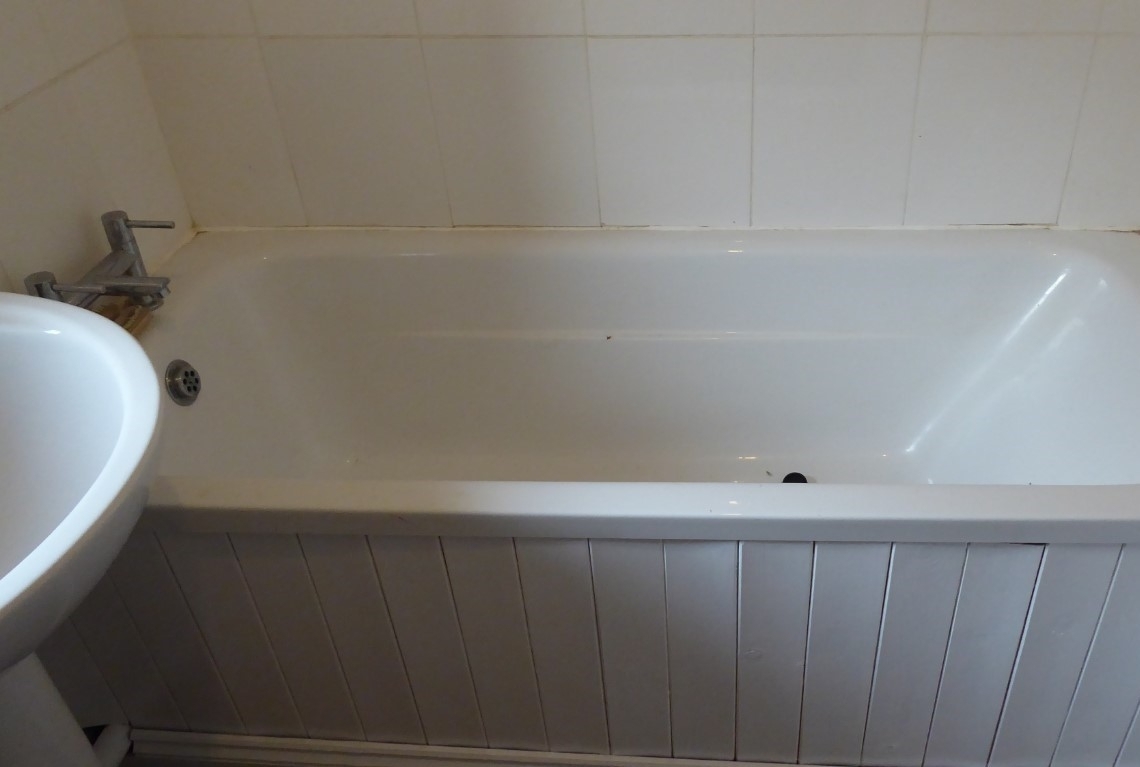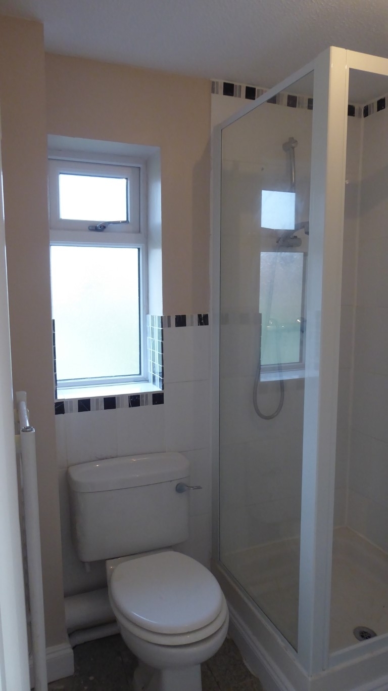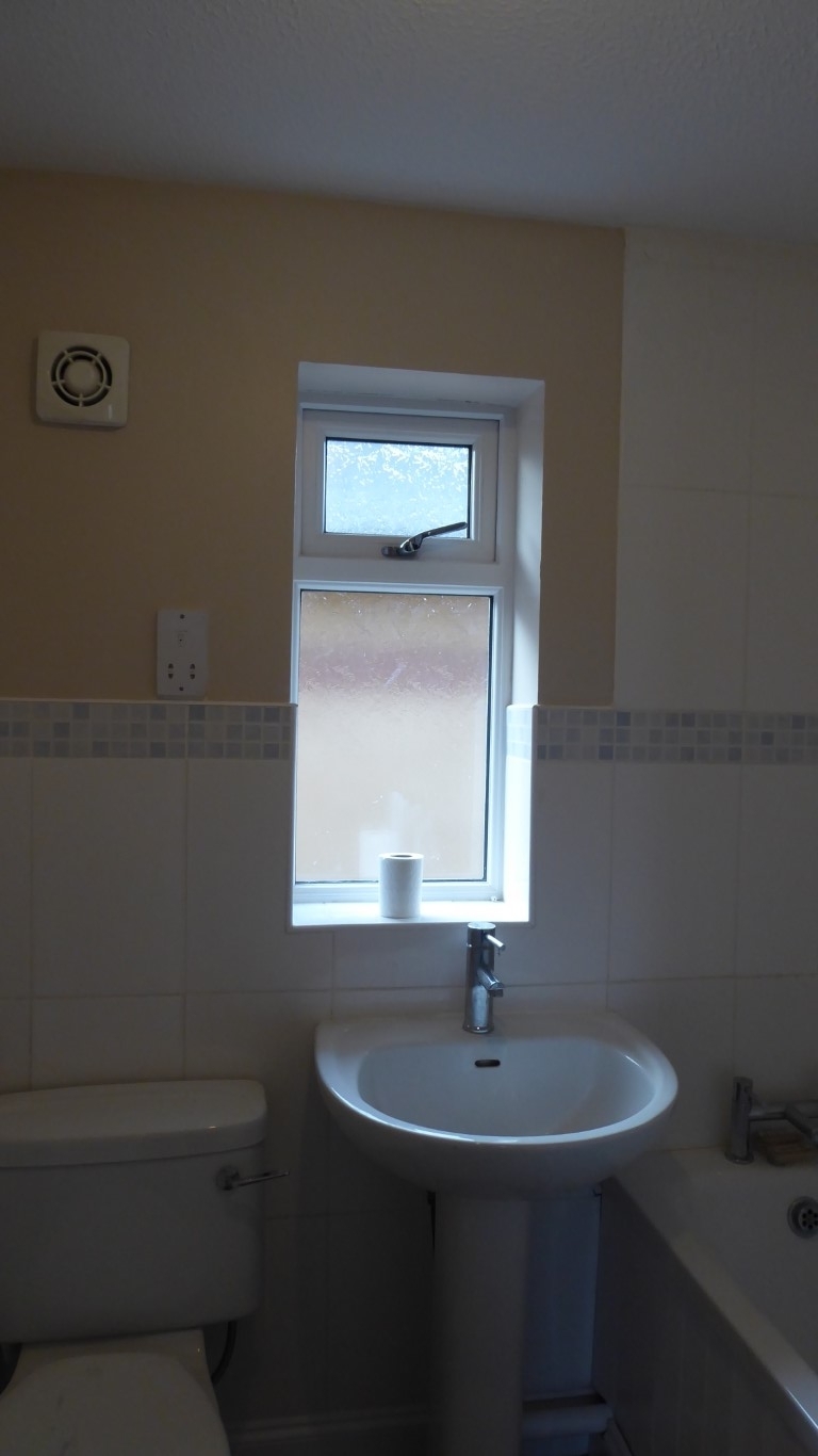 Suite comprising of low-level W.C., pedestal wash basin and bath with Tiling to water sensitive areas. Radiator. Opaque double-glazed window to side aspect.