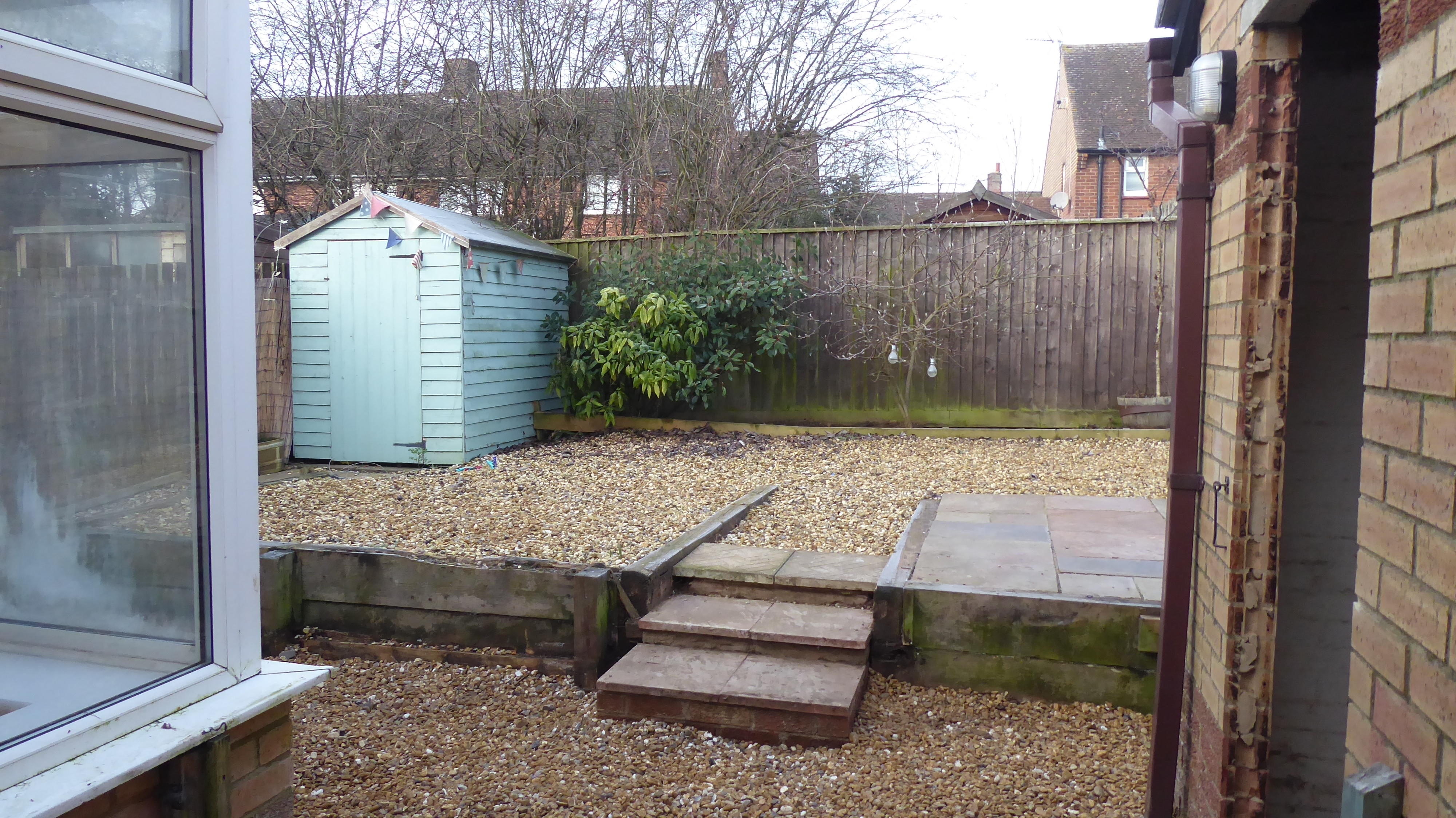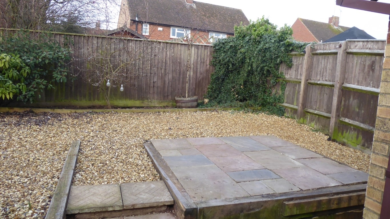 Secure garden accessed via slabbed area to garden completely laid to stone which raises up to a second level garden surrounded by timber fencing.